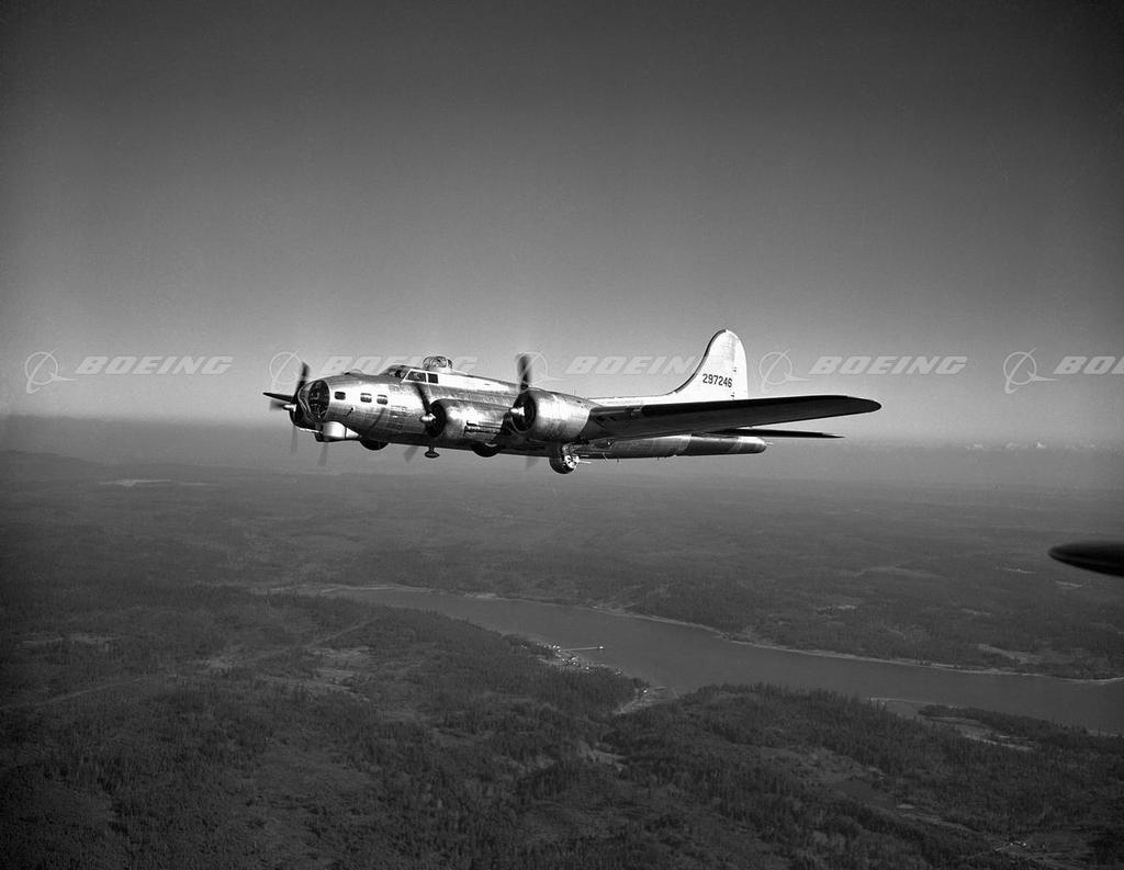 In response for the Army’s request for a large, multiengine bomber, the B-17 (Model 299) prototype, financed entirely by Boeing, went from design to flight test in less than 12 months. The B-17 Flying Fortress was a low-wing monoplane that combined aerodynamic features of the XB-15 giant bomber, and the Model 247 transport. The B-17 was the first Boeing military aircraft with a flight deck instead of an open cockpit and was armed with bombs and five .30-caliber machine guns mounted in clear blisters. Each version of the B-17 was more heavily armed. Described by General H. H. Hap Arnold, as the backbone of our worldwide aerial offensive, the B-17 Flying Fortress served in every World War II combat zone. Boeing, Douglas, and Lockheed Vega produced 12,731 B-17s, and the four-engine bombers became legendary for their ability to stay in the air after taking brutal poundings.