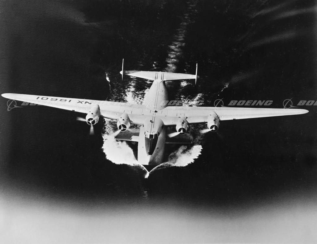 Boeing News photographer G. S. Williams in September 1938, captured this glittering image of the whale-shaped Boeing 314 Clipper. The largest passenger transport of its time, the flying boat took cruise ship elegance into the air. Luxurious amenities aboard included a stylish lounge, a dining salon, and a bridal suite. At 106 feet long with a 152-foot wingspan, it was the largest passenger transport in its time. At night, 74 seats converted into 40 bunks. It first flew in 1938 and on June 28, 1939, made the first scheduled transatlantic flight. In 1943, President Franklin Delano Roosevelt celebrated his birthday on a Model 314, flying to Casablanca and back, becoming the first U.S. president to fly while in office.