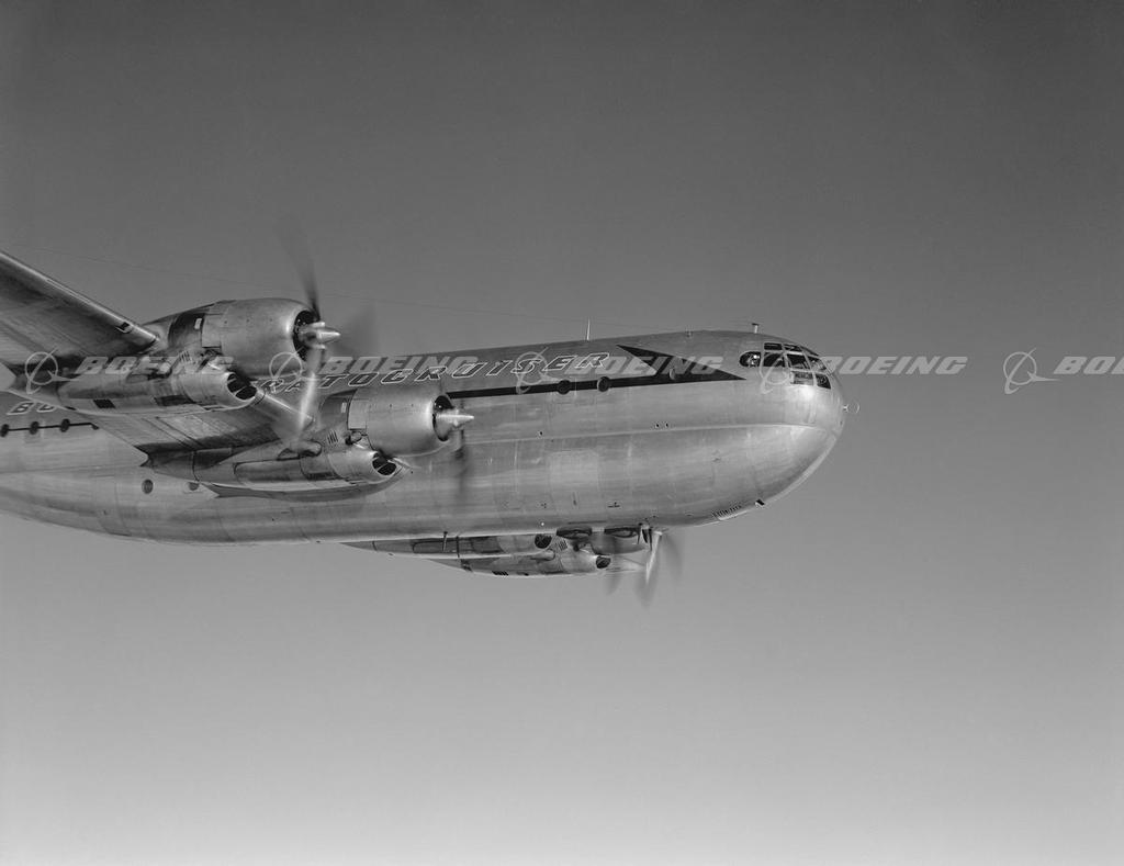 The 377 Stratocruiser was the last of the Boeing propeller-powered luxury airliners. Known as the “First Lady of the Airways,” it first flew in 1947 as the elegant, civilian offspring of the C-97, a military freighter that carried soldiers and equipment during World War II. A circular stairway led from the cabin to a lower deck luxury lounge. As a sleeper, it held 28 upper- and lower-bunk units. The first Stratocruiser began service in 1949 between San Francisco to Honolulu. Only five years later, the Boeing “Dash 80” prototype for the Model 707 made its first flight, and the Stratocruiser became obsolete. It found a new career as special transport for large sections of spacecraft. With its fuselage swollen by a superstructure, the once-elegant Stratocruiser became known as the “Pregnant Guppy” and, even larger, as the “Super Guppy.”