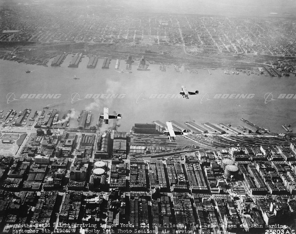 Ordered by the U.S. Army Air Service, Douglas built five Douglas World Cruisers to attempt the first flight around the world. The first DWC, a prototype delivered for test and evaluation, made its first flight in November 1923. Douglas soon received a contract for four production aircraft. On March 17, 1924, four DWCs left Clover Field, Santa Monica, Calif., for Seattle, Wash., the official starting point. While in Seattle, Boeing employees exchanged the planes' wheels for pontoon floats for the long over-water flights. It was also in Seattle that the planes were formally named for four major American cities, Seattle, Chicago, Boston and New Orleans. On April 4 the four took off from Sand Point on Lake Washington on the first leg of their long flight. The Seattle, trapped in fog on April 30, crashed on an Alaskan mountainside. After walking ten days through the frozen wilderness, the two-man crew safely reached Dutch Harbor. The other three DWCs continued on and were kept flying with the help of 15 extra engines, 14 extra sets of floats and duplicates of all airframe parts, stashed at various sites around the world. On June 26 they reached Calcutta in India where the floats were replaced with wheels. The DWCs departed Orkney Island in Scotland on July 30, again as seaplanes. On August 3, with nearly three-quarters of the flight completed, the Boston made a forced landing in the mid-Atlantic. The crew was rescued and reunited with the Chicago and New Orleans on September 3 in Nova Scotia. Two days later the prototype DWC joined the group and was named Boston II, so the original's crew could complete the flight. On September 28, as landplanes, they returned to Seattle. They had logged 27,553 miles in six months and six days, flown over 28 countries and crossed the Atlantic and Pacific Oceans. The flight was the greatest feat in aviation up to that time and earned Douglas Aircraft Company its motto, First Around the World.