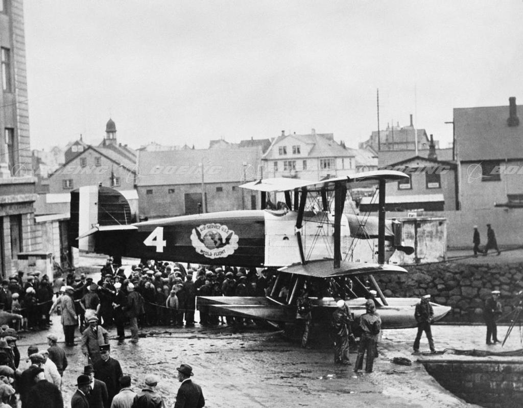 Ordered by the U.S. Army Air Service, Douglas built five Douglas World Cruisers to attempt the first flight around the world. The first DWC, a prototype delivered for test and evaluation, made its first flight in November 1923. Douglas soon received a contract for four production aircraft. On March 17, 1924, four DWCs left Clover Field, Santa Monica, Calif., for Seattle, Wash., the official starting point. While in Seattle, Boeing employees exchanged the planes' wheels for pontoon floats for the long over-water flights. It was also in Seattle that the planes were formally named for four major American cities, Seattle, Chicago, Boston and New Orleans. On April 4 the four took off from Sand Point on Lake Washington on the first leg of their long flight. The Seattle, trapped in fog on April 30, crashed on an Alaskan mountainside. After walking ten days through the frozen wilderness, the two-man crew safely reached Dutch Harbor. The other three DWCs continued on and were kept flying with the help of 15 extra engines, 14 extra sets of floats and duplicates of all airframe parts, stashed at various sites around the world. On June 26 they reached Calcutta in India where the floats were replaced with wheels. The DWCs departed Orkney Island in Scotland on July 30, again as seaplanes. On August 3, with nearly three-quarters of the flight completed, the Boston made a forced landing in the mid-Atlantic. The crew was rescued and reunited with the Chicago and New Orleans on September 3 in Nova Scotia. Two days later the prototype DWC joined the group and was named Boston II, so the original's crew could complete the flight. On September 28, as landplanes, they returned to Seattle. They had logged 27,553 miles in six months and six days, flown over 28 countries and crossed the Atlantic and Pacific Oceans. The flight was the greatest feat in aviation up to that time and earned Douglas Aircraft Company its motto, First Around the World.