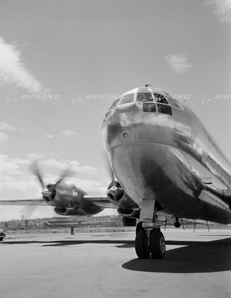 The 377 Stratocruiser was the last of the Boeing propeller-powered luxury airliners. Known as the “First Lady of the Airways,” it first flew in 1947 as the elegant, civilian offspring of the C-97, a military freighter that carried soldiers and equipment during World War II. A circular stairway led from the cabin to a lower deck luxury lounge. As a sleeper, it held 28 upper- and lower-bunk units. The first Stratocruiser began service in 1949 between San Francisco to Honolulu. Only five years later, the Boeing “Dash 80” prototype for the Model 707 made its first flight, and the Stratocruiser became obsolete. It found a new career as special transport for large sections of spacecraft. With its fuselage swollen by a superstructure, the once-elegant Stratocruiser became known as the “Pregnant Guppy” and, even larger, as the “Super Guppy.”
