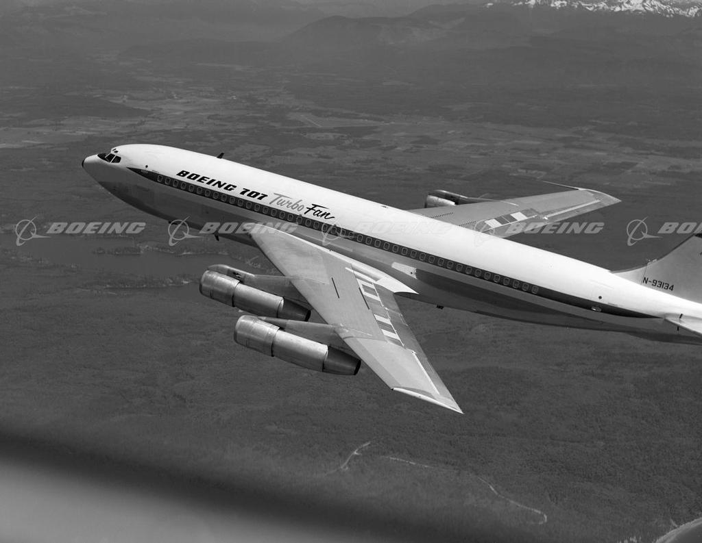 After the Air Force agreed to let Boeing build commercial jets based on the prototype, 367-80, already the basis for the KC-135 military tanker, airlines began to order the 707, the commercial transport variant of the Dash 80. The 707 and the KC-135 had many features in common. Both were visually distinct, with a stinger antenna pointing forward from the top of their vertical fin. The 707's width and 100-foot length made it the largest passenger cabin in the air at the time. Placement of its more than 100 windows allowed airlines to rearrange seats. Location of passenger doors on the left side, at the front and at the rear of the cabin, became standard for subsequent Boeing jets. The exteriors of the 707 and its competitor, the DC-8, were almost identical, but the 707 wing had more sweepback, so it could fly about 20 mph faster.