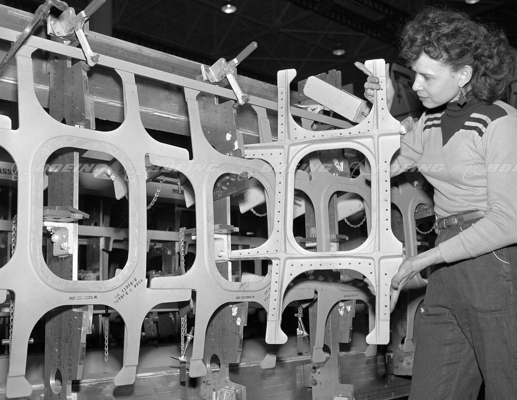 After the Air Force agreed to let Boeing build commercial jets based on the prototype 367-80, already the basis for the KC-135 military tanker, airlines began to order the 707, the commercial transport variant of the Dash 80. The 707 and the KC-135 had many features in common. Both were visually distinct, with a stinger antenna pointing forward from the top of their vertical fin. The 707's width and 100-foot length made it the largest passenger cabin in the air at the time. Placement of its more than 100 windows allowed airlines to rearrange seats. Location of passenger doors on the left side, at the front and at the rear of the cabin, became standard for subsequent Boeing jets. The exteriors of the 707 and its competitor, the DC-8, were almost identical, but the 707 wing had more sweepback, so it could fly about 20 mph faster.