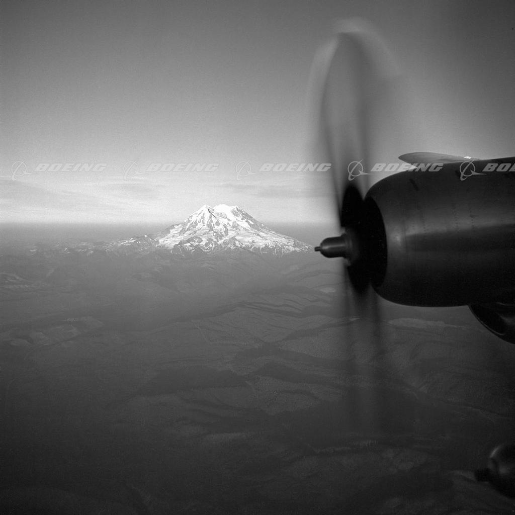 Majestic Mt. Rainier looms large and impressive in this aerial view taken from a Boeing C-97. Mt. Rainier is the third highest peak in the continental United States.