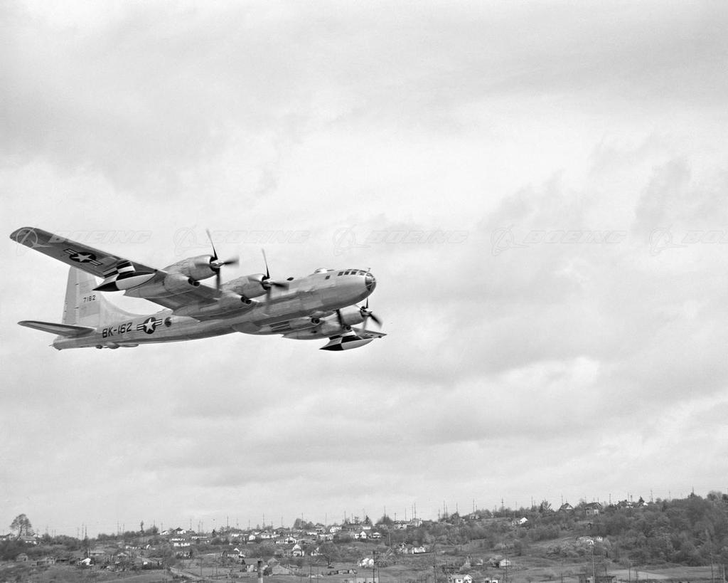 The four-engine, propeller-powered B-50 bomber, which first flew in 1947, was among the last piston-powered bombers built during an era that was to be dominated by jets. However, in 1949, the B-50A, the Lucky Lady II, made the first nonstop flight around the world in 94 hours, refueled in flight four times by KB-29Ms. The B-50 originally evolved from the B-29D but because it included so many improvements, it was redesignated the B-50A, with 59 percent more power than the B-29. The next version, the B-50B, fitted with cameras and wing tanks, was designated RB-50B and used for strategic reconnaissance. The B-50D, the most common variant, was distinguished by a one-piece transparent-plastic nose molding and an optically flat bombardier’s window in the lower portion. Some B50s were later converted to hose-type KB-50 aerial tankers, their speed enhanced by the addition of two 5,200-pound-thrust jet engines, so at 400 mph, they could refuel jet aircraft. One KB-50D became a drone to test Bell XGAM missiles and 36 became long-range reconnaissance aircraft (WB-50D).