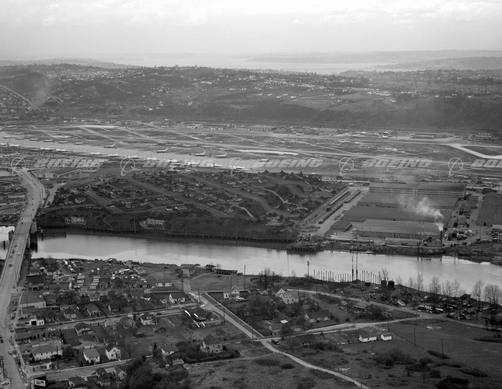 During WWII, a 26-acre make-believe village was constructed on top of Boeing's Plant II in Seattle to provide a wartime cover for the facility. This camouflage scheme for the plant also extended out over neighboring Boeing Field. Continuing the residential-suburb pattern of the factory roof, Boeing Field's camouflage outlined a more sparsely settled community. The roads - dark strips of oil-soaked earth - extended across the airstrips and up the side of Beacon Hill. The "houses" were painted slabs of concrete, about six inches high. Real grass helped to complete the residential effect. The make-believe roads on the side of the hill were simply swaths cut through low brush. Around Boeing Field, vegetable gardens were burlap-garnished wire on stone facings and the use of infra-red paint gave trees an evergreen appearance.