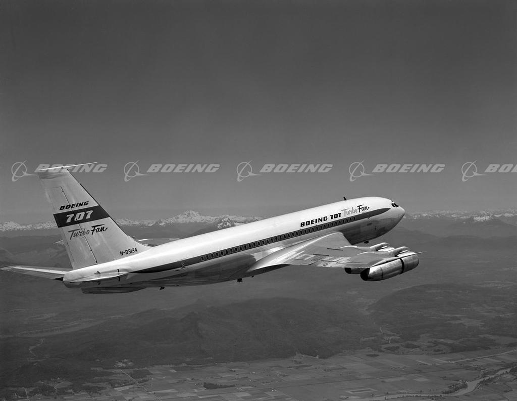 After the Air Force agreed to let Boeing build commercial jets based on the prototype, 367-80, already the basis for the KC-135 military tanker, airlines began to order the 707, the commercial transport variant of the Dash 80. The 707 and the KC-135 had many features in common. Both were visually distinct, with a stinger antenna pointing forward from the top of their vertical fin. The 707's width and 100-foot length made it the largest passenger cabin in the air at the time. Placement of its more than 100 windows allowed airlines to rearrange seats. Location of passenger doors on the left side, at the front and at the rear of the cabin, became standard for subsequent Boeing jets. The exteriors of the 707 and its competitor, the DC-8, were almost identical, but the 707 wing had more sweepback, so it could fly about 20 mph faster.