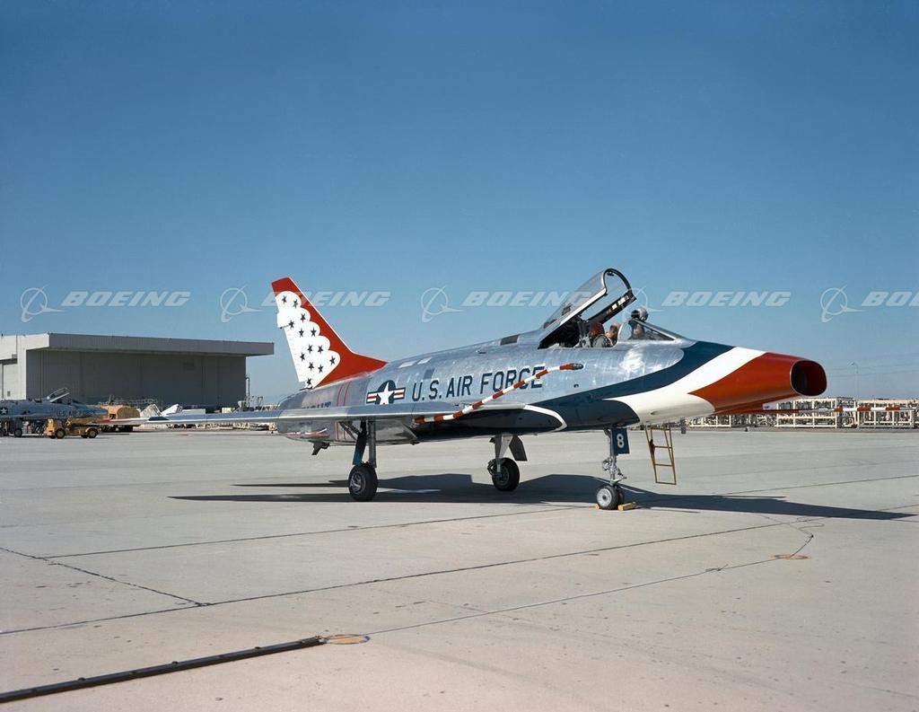 The F-100 Super Sabre was a sleek, swept-back-wing fighter that gave the United States a supersonic Air Force. Since May 1953, when the first prototype model, the YF-100, bettered the speed of sound on its first flight, the versatile fighter set numerous records for speed, endurance, range and maintenance. Late production models of the F-100D and F-100F had the capability of being launched from remote areas in the manner of manned missiles. Of the 2,290 Super Sabres produced, 1,274 F-100Ds included the first autopilot designed for a supersonic jet. Powered by a 16,950-pound-thrust afterburning jet engine, the F-100 was armed with four 20-millimeter cannons, two GAM 83A Bulldog missiles, four Sidewinder missiles, rockets, special stores, and/or 7,040 pounds of bombs.To demonstrate the ability of its pilot and aircraft, the Air Force chose F-100 Super Sabres to perform throughout the world in aerial precision demonstration flights. The famed Thunderbirds, a four-man aircraft team, were viewed by over 19 million people as the storied pilots performed intricate precision maneuvers at low altitude.