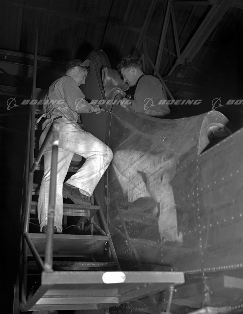 A Douglas "Rosie" in Long Beach Rivets a Boeing B-17 Tail