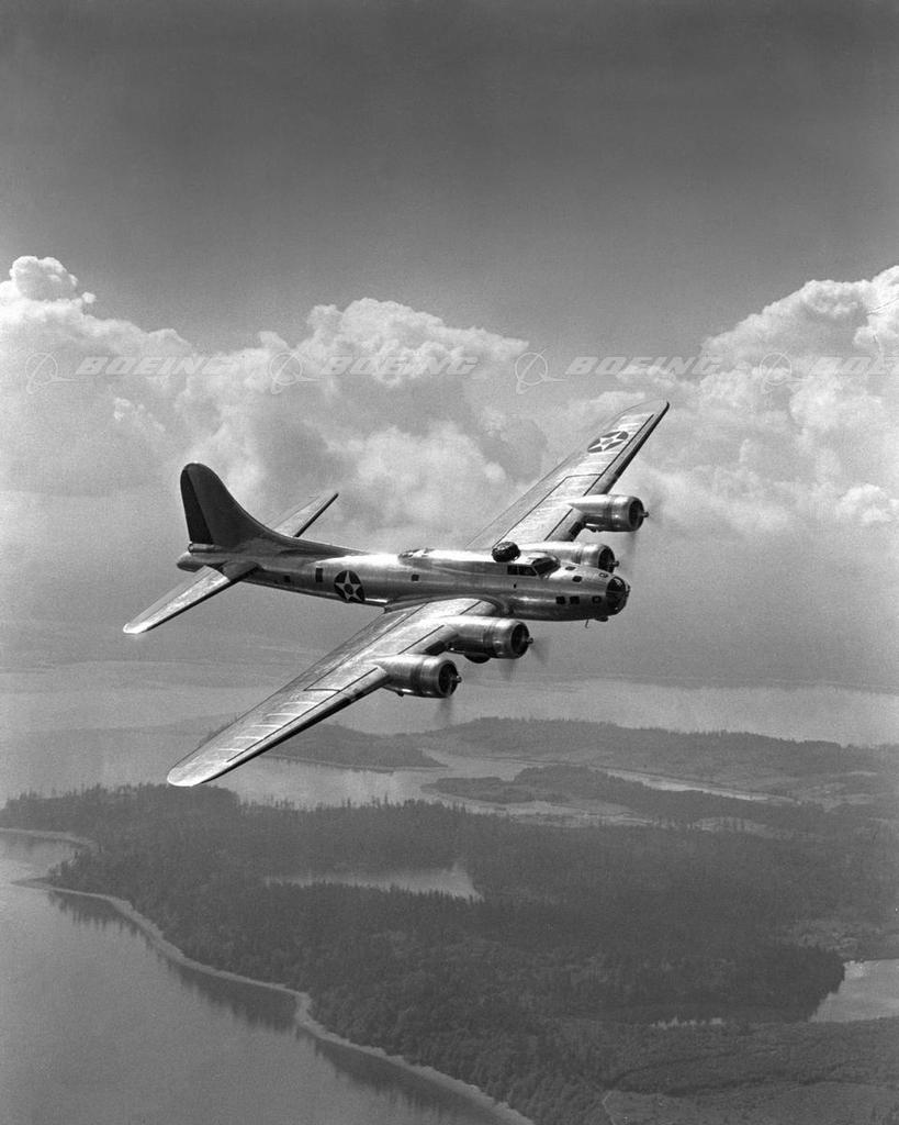 The Boeing B-17E of 1941. The B-17E was the first "offensive" model of the Flying Fortress family. It first flew on September 5, 1941, and in the ensuing year many hundreds were produced at Boeing, Douglas and Lockheed. Among the major changes were a longer fuselage, increased fin area, dorsal and ventral power turrets, tail gun position and increased nose armament. Gross weight was increased to 60,000 pounds, and top speed to 325 mph. A total of 512 was built.