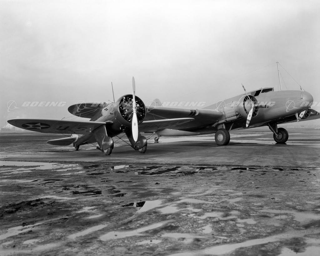 The Boeing P-26 and the Boeing Model 247 on the tarmac side by side