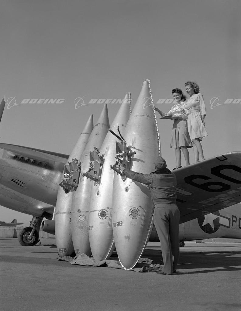 Women on P-82 Twin Mustang Wing with Drop Tanks
