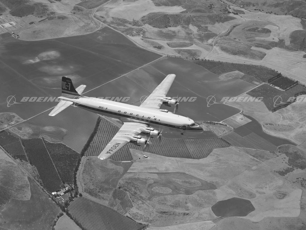 Douglas DC-7 (1953-1958): On May 18, 1953, Douglas introduced the DC-7, a larger and faster airliner than its DC-4 and DC-6 look-a-like predecessors. The DC-7 was powered by four “turbo-compound” engines, which enabled it to fly nonstop across the United States westbound against prevailing winds - a capability which the airlines of the day had dreamed of for years. A later version, the DC-7C, provided an even greater range capability that enabled it to fly anywhere in the world, thus earning the nickname “Seven Seas.” A total of 338 DC-7s were produced from 1953 to 1958, all for commercial airline customers. TheDC-7 was the last propeller driven airliner built by Douglas and the last built at the Santa Monica plant in Southern California.