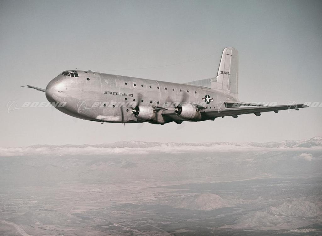 Douglas C-124 Globemaster II (1949-1955): The C-124 Globemaster II was an improved version of the 1945 Douglas C-74 Globemaster. The C-124 featured a gigantic fuselage, with clamshell doors under the plane's nose that allowed dive-in access to a cargo compartment almost 12 foot high. It made its first flight on November 27, 1949 from the Douglas plant at Long Beach, Ca. Its delivery to the U.S. Air Force coincided with the onset of the Korean War and the C-124 played an important role in the airlift of supplies to the Far East. The C-124 could carry more cargo, longer distances than any other military transport of the time. It could accommodate 200 troops, or 123 stretchers, or up to 74,000 pounds of cargo. The last of 448 C-124 Globemaster IIs were delivered to the Air Force in 1955, but the big plane's dependability allowed it to remain in service until 1978.