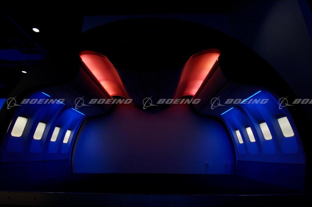 A highlight inside the Customer Experience Center in Renton, WA is the interior arch of a Boeing 767 that projects enhanced interior retrofits. The 767 Enhanced Interior has a similar look and feel to the 767-400, featuring new ceiling panels, centerline bins, and new outboard bin doors.