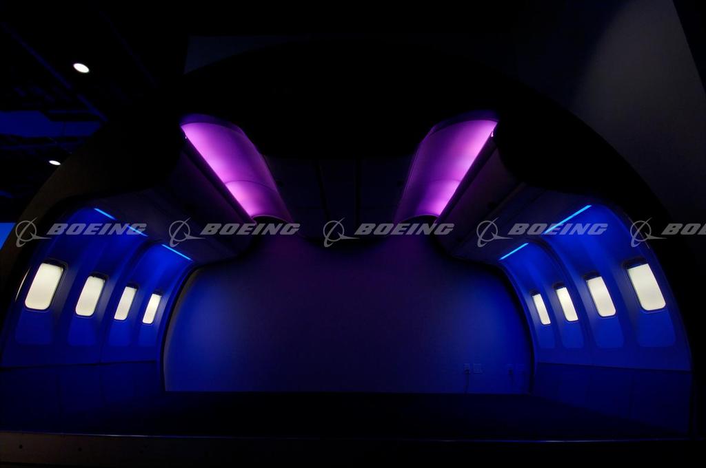 A highlight inside the Customer Experience Center in Renton, WA is the interior arch of a Boeing 767 that projects enhanced interior retrofits. The 767 Enhanced Interior has a similar look and feel to the 767-400, featuring new ceiling panels, centerline bins, and new outboard bin doors.
