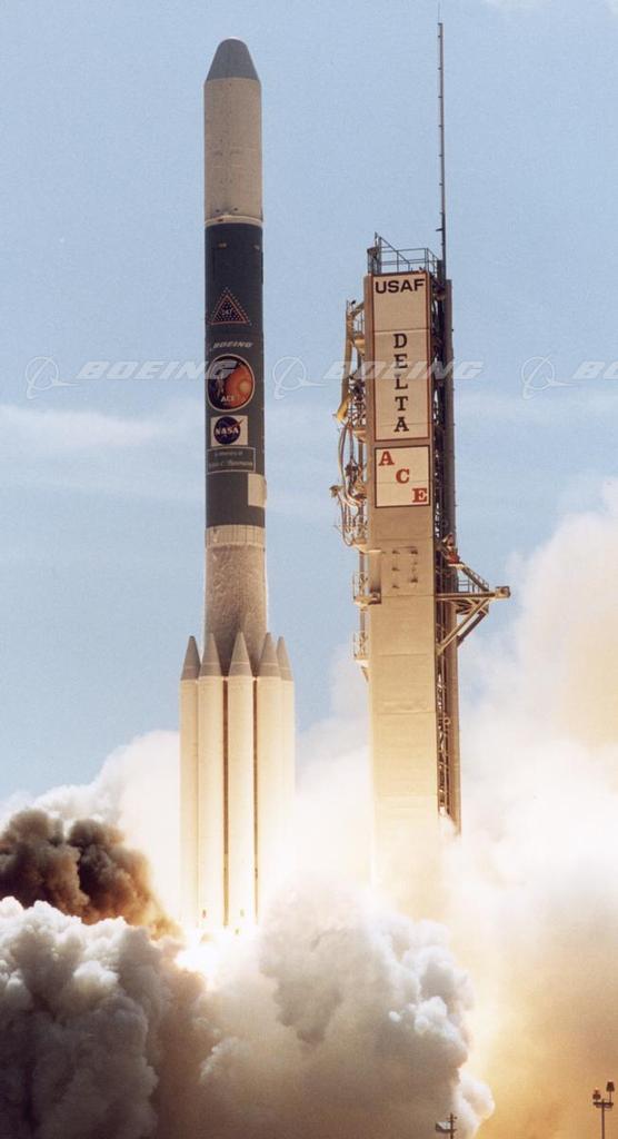 A Boeing Delta II 7920-8 rocket launches the ASA Advanced Composition Explorer (ACE) observatory into orbit from Cape Canaveral Air Station. The Delta II second stage delivered the observatory into an elliptical transfer orbit. ACE then used its own propulsion system to establish an orbit between the Earth and the sun. Approximately one million miles from Earth, the ACE observatory conducted its mission to examine the composition of several different types of solar and galactic matter.