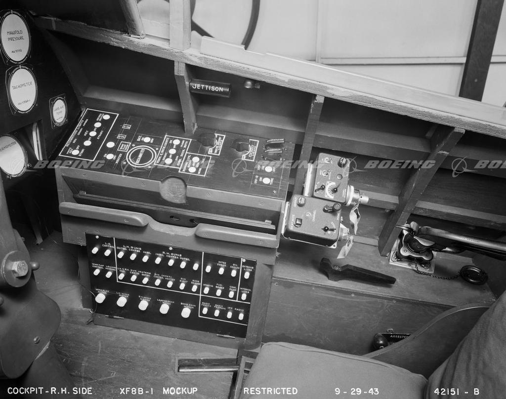 The XF8B-1 fighter-bomber was the heaviest carrier-based airplane built before the end of World War II. The XF8B-1 could be flown as a torpedo bomber and, because of its single-seat configuration, could also be used as a fighter. Because of its size and great horsepower, the XF8B-1 used an unusual dual six-blade contrarotating propeller. It carried bombs internally and extra fuel externally, and its six machine guns were mounted inside the folding wings.