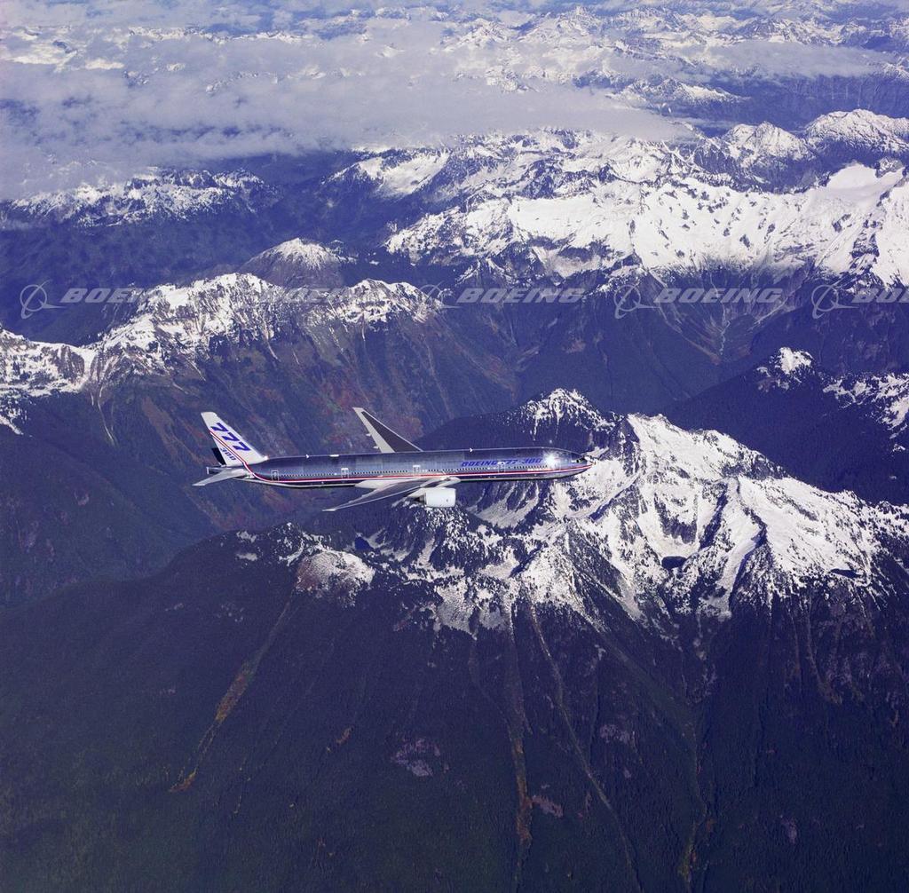 During its maiden flight on Oct. 16, 1997, the 777-300 took off into clear, sunny skies and reached a maximum altitude of 17,000 feet (5,100 meters). Decked out in a Boeing paint scheme of red, white and blue stripes on a polished aluminum fuselage, the airplane headed north above Puget Sound, passing over the San Juan Islands. Turning west, the world's longest commercial jetliner soared above the Strait of Juan de Fuca and out to the Pacific Ocean, west of the snow-crowned Olympic Mountains. It returned through the strait and a landing at Boeing Field in Seattle.