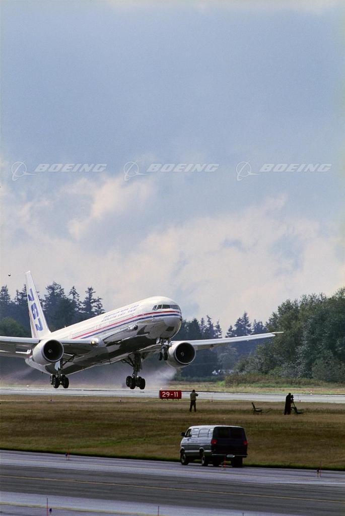 The 767-400ER (extended range) rose into the sky above Paine Field in Everett, Wash., on Oct. 9, 1999 for the first time, and headed west down the Strait of Juan de Fuca. The airplane, identified as VQ001, lifted off the runway at 12:10 p.m. During the flight a series of tests were conducted on the airplane's systems and structures. Flight-test equipment on board recorded and transmitted data to a flight-test control room at Boeing Field in Seattle. The debut flight signalled the official beginning of a six-and-a-half-month flight-test program for the 767-400ER, during which this airplane, and two other 767-400ERs accumulated approximately 800 flight hours and 1,100 ground-test hours. At the conclusion of flight tests, the 767-400ER achieved certification by the U.S. Federal Aviation Administration and concurrence by the European Joint Aviation Authorities.