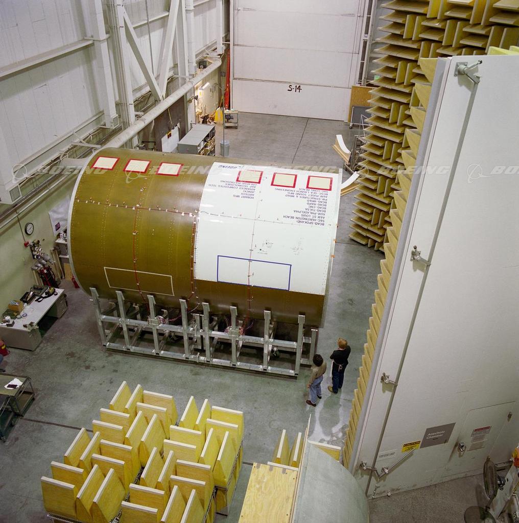 Boeing conducts structural acoustics testing on aircraft fuselages in the Interior Noise Test Facility (INTF). This facility features both an anechoic and a reverberant chamber and is designed to test and measure noise from environmental control systems and hydraulic systems. The INTF can accomodate testing systems and complete aircraft fuselage sections.