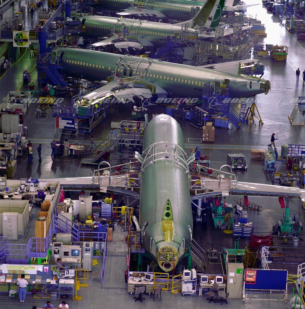Production of 737s at Boeing's Renton, WA factory. In 2002 the 737 manufacturing process converted to a moving line system, replacing the station to station method of assembly pictured here.