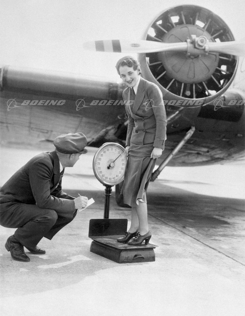 The Model 247 had just enough room for the flight attendant to walk in the aisle and also step over the two wing spars that ran through the middle of the cabin. An airplane can carry only so much, and the weight of the stewardess and her equipment (lunches, thermos jugs of coffee, blankets, pillows, magazines, fly swatter, etc.) was figured in as a constant part of the weight of the airplane - 135lbs was allowed for the stewardess and 121.5 lbs for her equipment. Knowing this allowed the airline to determine how much weight it could carry between the ten passengers and mail. There was no need to weigh the pilots. The 247 cockpit was so tiny that the pilot had to be average height at best and slim - otherwise he would not be able to get into his seat.