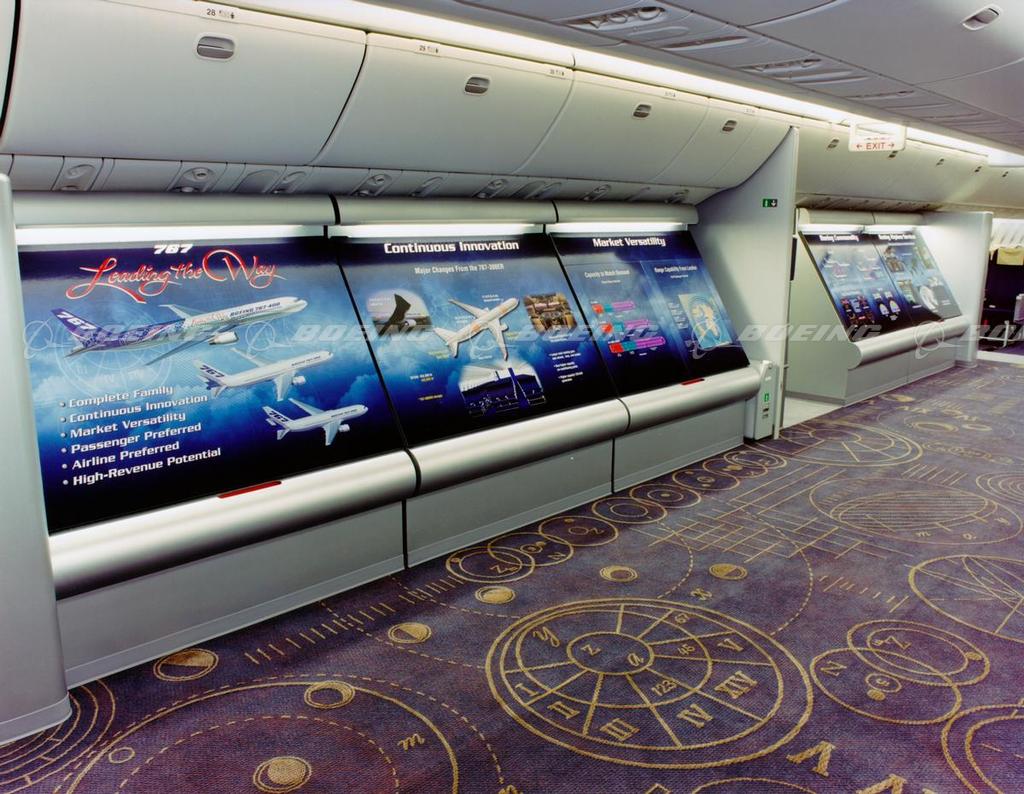 On July 20, 2000, a Boeing 767-400ER extended range) airplane - which at the time, was the newest member in the 767 family of airplanes - took off from Boeing Field on an around-the-world tour that took the airplane to 17 cities and three continents, including the Farnborough Air Show. This 767 had a one-of-a-kind World Tour design inside and out. Both the airplane's distinctive livery and its interior featured graphics and fabrics that reflected the human fascination with flight. Illustrations from the Greek myths of Pegasus and Mercury were beautifully woven into the carpets. The cabin decor featured Leonardo da Vinci's drawings.