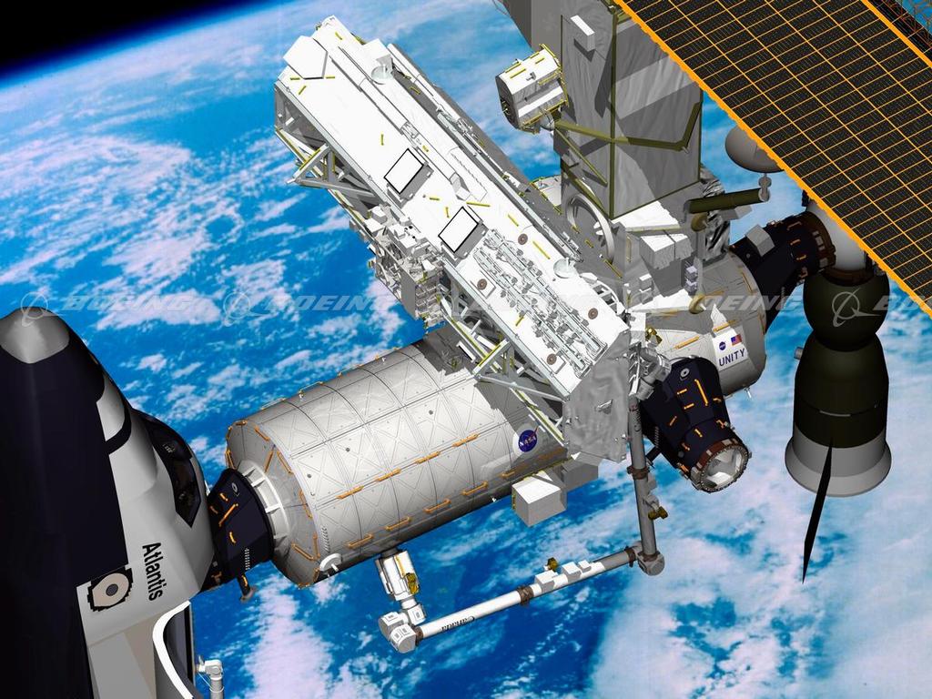 This artist's conception pictures the Orbiter Atlantis delivering the S0 truss (starboard zero or S-Zero) to the ISS during STS-110 mission in April 2002. The S0 truss is the centerpiece of the ISS framework, it supports solar panels providing additional power to the International Space Station. The payload also included the first part of a Mobile Transporter designed to provide a moveable base for the Station’s Canadian robotic arm.
