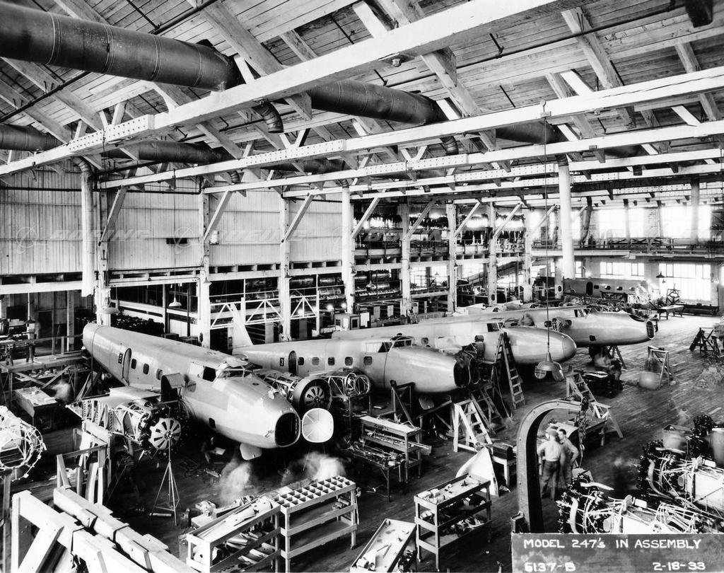 The revolutionary Boeing Model 247, developed in 1933, was an all-metal, twin-engine airplane and the first modern passenger airliner. It had a gyro panel for instrument flying, an autopilot, pneumatically operated de-icing equipment, a variable-pitch propeller and retractable landing gear.