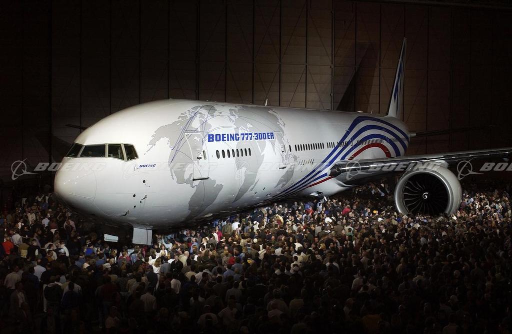 In front of thousands of employees, suppliers, partners and customers, Boeing unveiled to the world the newest member of the 777 family, the 777-300ER (extended range), on Nov. 14, 2002 at the final assembly Plant in Everett, Washington. The airplane was unveiled in a dramatic ceremony where 26 five-by 50-foot banners with the numbers "777" were dropped from the factory ceiling to reveal the airplane.