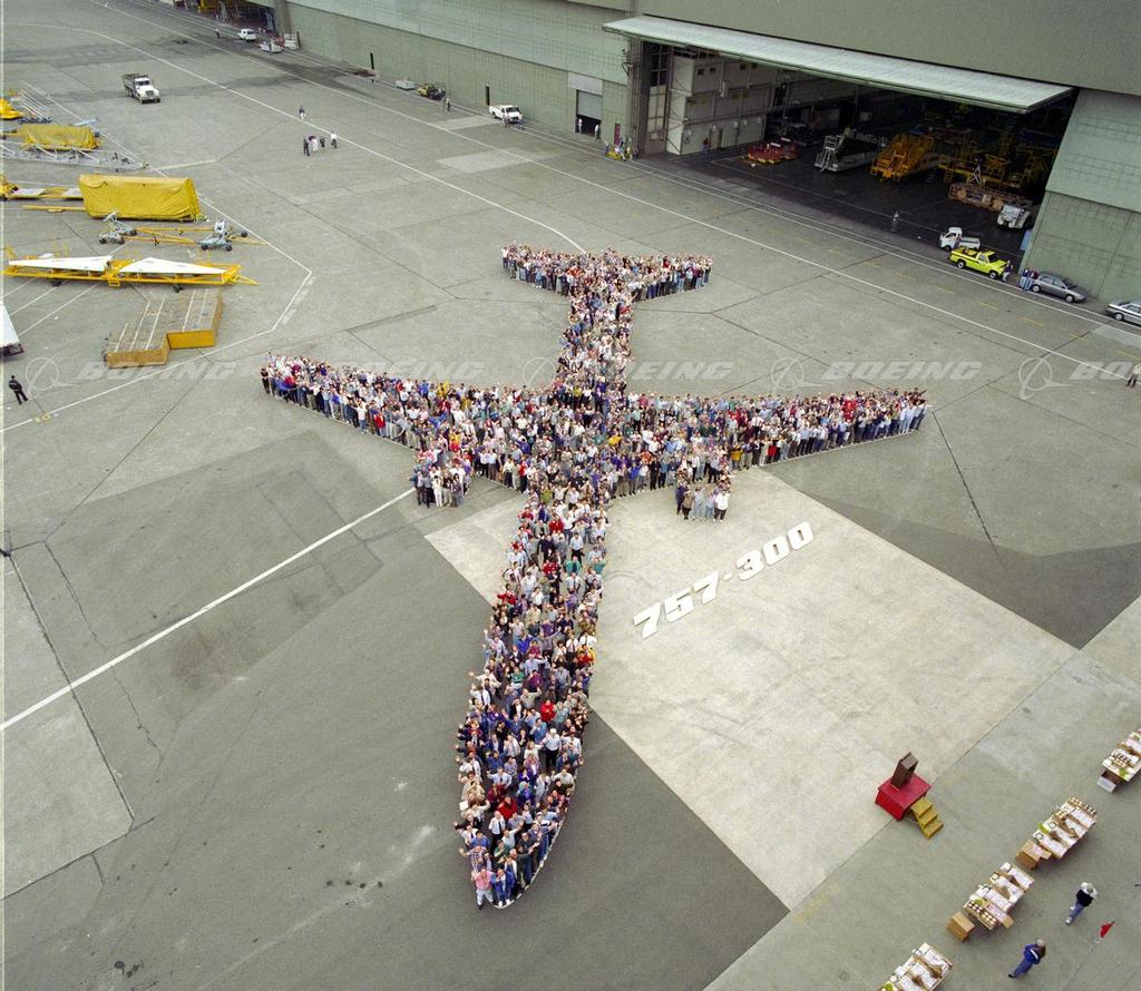 September 26,1997 - Nearly 1,000 Boeing employees who design and build the Boeing 757-300 form the shape of the airplane -- in its actual size -- at the Boeing plant in Renton, Washington. The 757-300, which is 178 feet, 7 inches (54.5 meters) long, is the largest and longest single-aisle airplane ever built by Boeing. The airplane, a derivative of the Boeing 757-200, carries between 243 and 289 passengers. The first 757-300 is scheduled to deliver to Condor Flugdienst, a German charter airline, in January 1999.