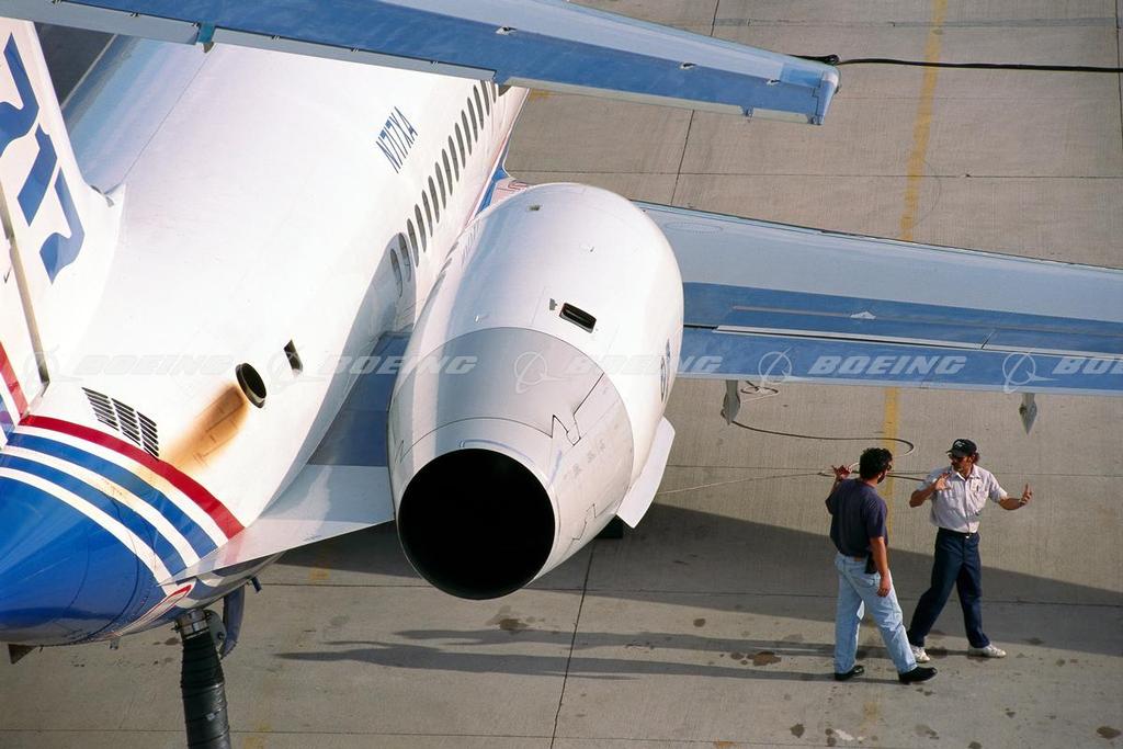 Aircraft Service Worker Under the Left Engine Pod of a 717-200