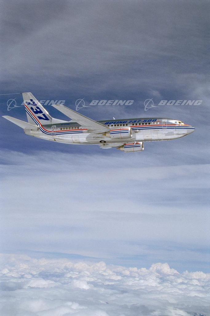 Although it has the largest model designator of its generation, the 737-500 is actually smaller than either the 737-300 or the 737-400. The 737-500 is 101 ft 9 in long and can seat up to 132 passengers in an all-economy configuration. It was built to replace the 737-200. About the same size as the 737-200, it is the smallest member of the 737 family, but uses all the advanced technologies of the larger 737-300 and 737-400 models. The 737 family of jets share the reliability, simplicity, family commonality, and low maintenance costs that have made the 737 the favorite of the world's airlines.