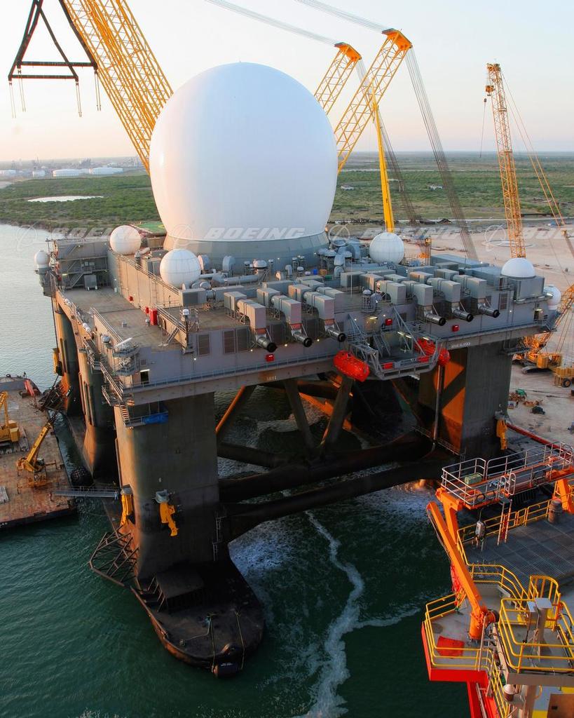 The Sea-Based X-Band Radar (SBX), a key component of the U.S. Missile Defense Agency's Ground-based Midcourse Defense system, is shown with the radome covering fully inflated atop the sea-going platform along the dock in Corpus Christi, Texas.