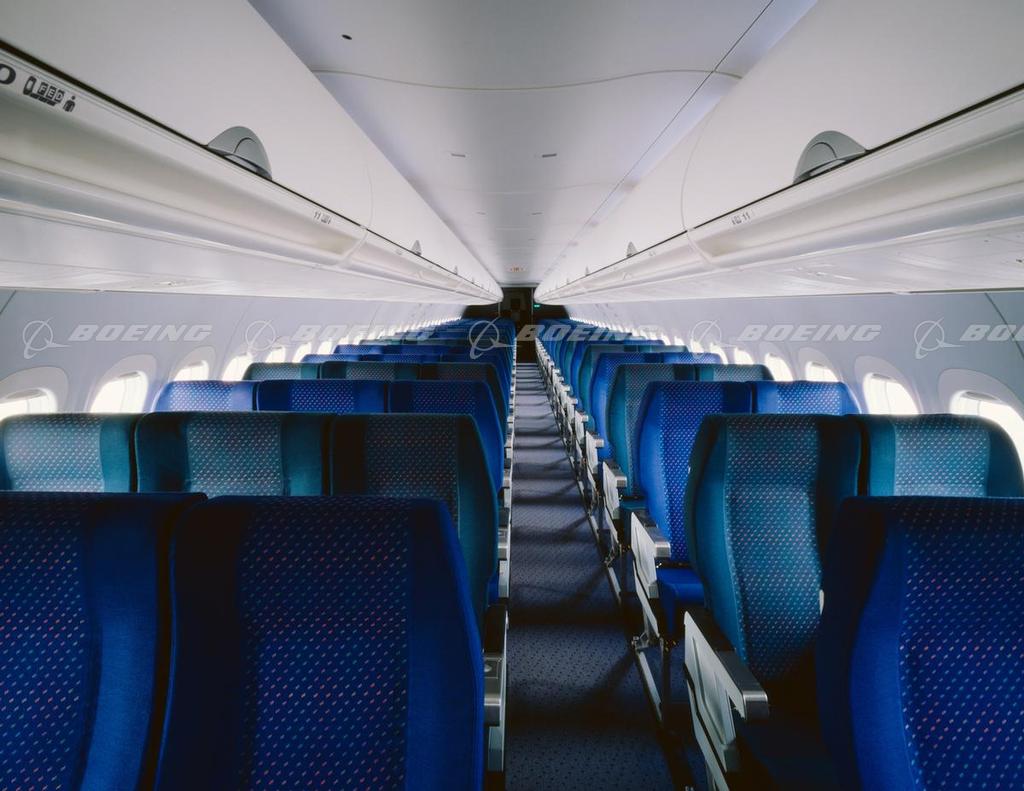 The standard 717 has a two-class configuration with 106 seats. Its passenger-pleasing interior features a five-across-seating arrangement in economy class, with illuminated handrails and large overhead stowbins.