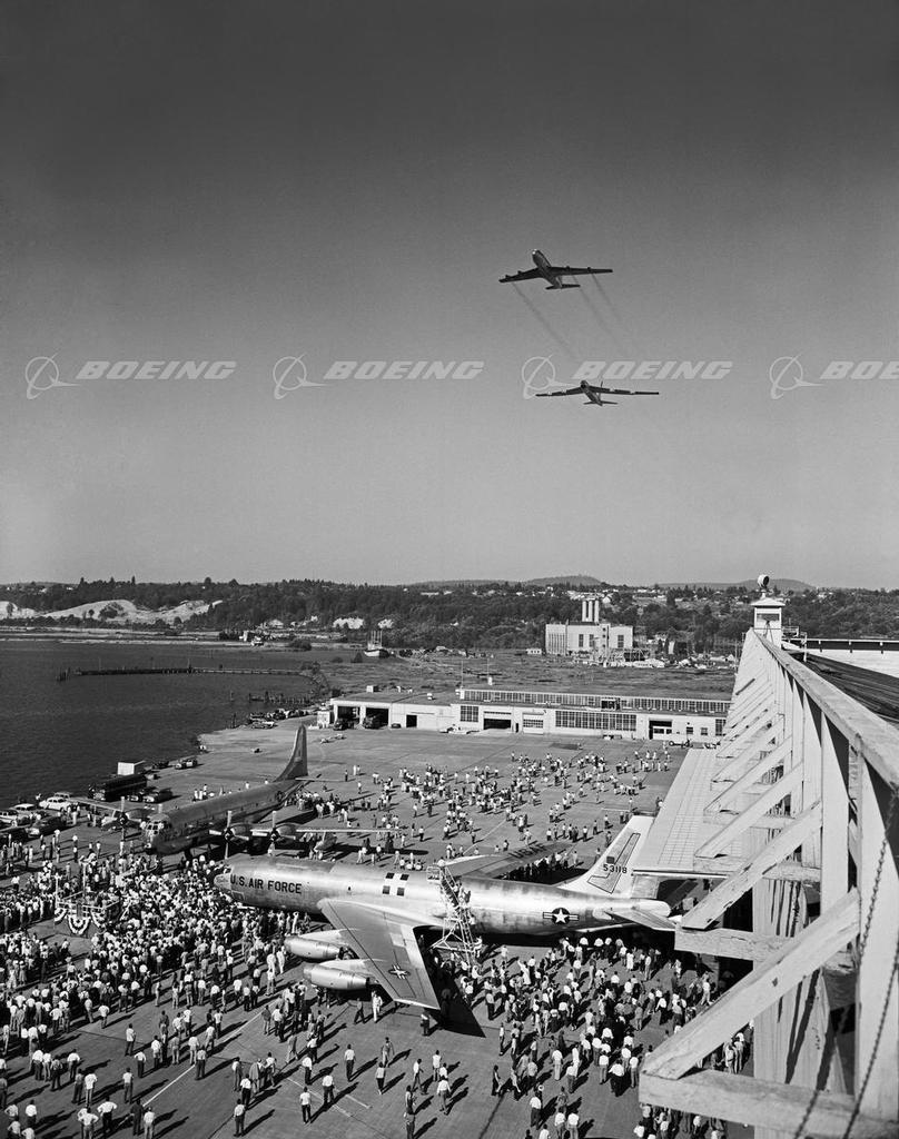 Dash 80 and B-52 Fly Over KC-135 Rollout, with KC-97 in Background