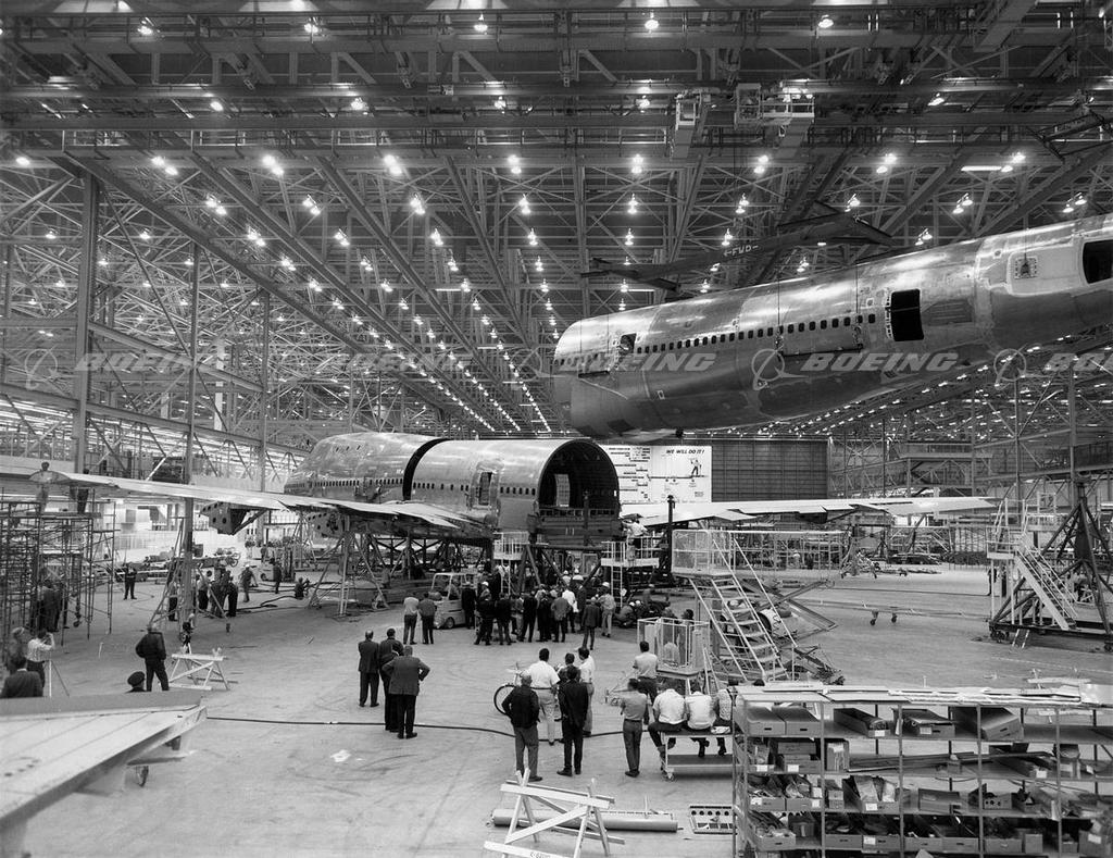 Production of the first 747s began as final phases of the Everett factory building project were completed.