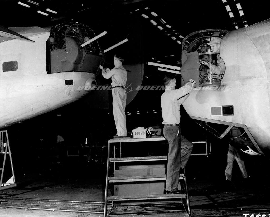 Workers Line Up Machine Guns on a B-17 Flying Fortress Chin Turret