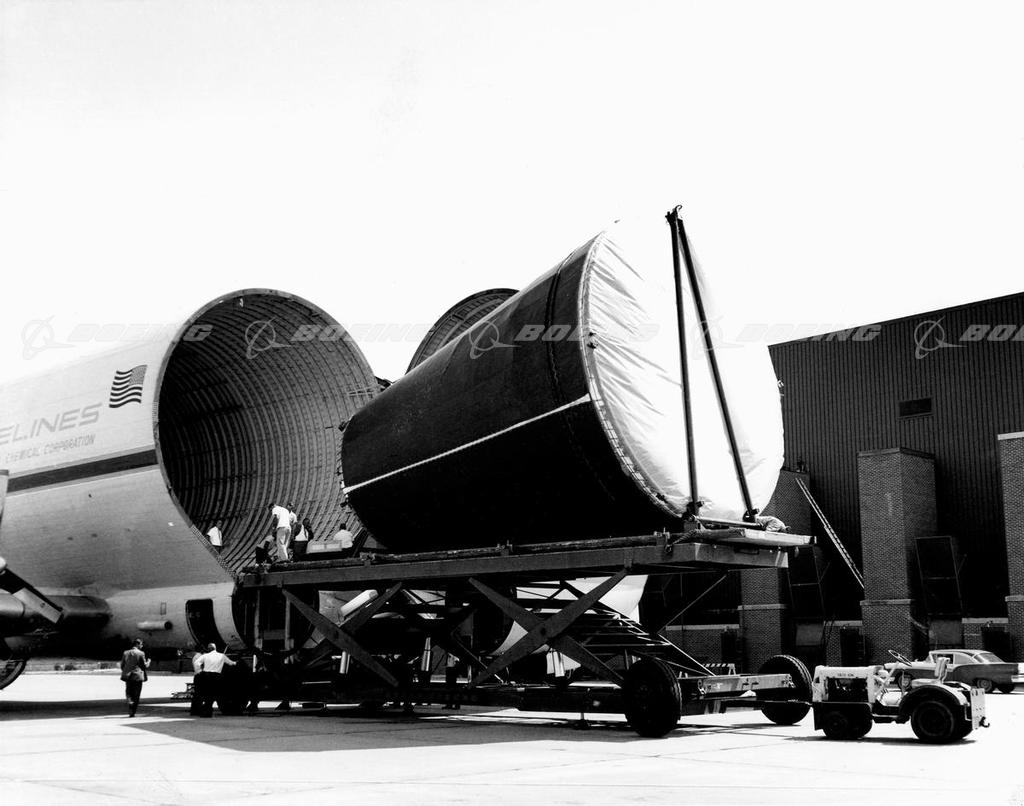 During the early 1960s, Aero Space Lines ballooned the Stratocruiser's fuselage into a whale-like shape to carry spacecraft sections. The Saturn Lunar Adapter shown being loaded into the Super Guppy is where the Lunar Module (LM) is stored and protected during the launch of a Saturn V rocket.