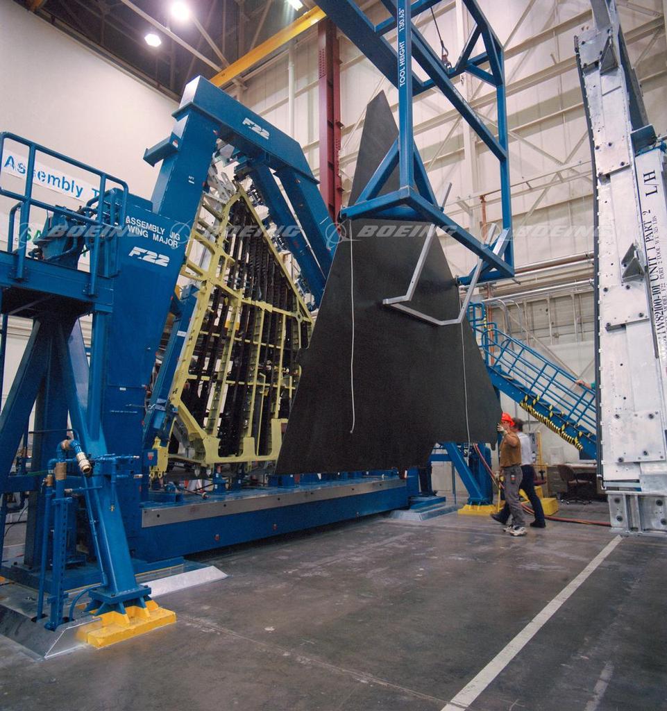 In this photo, an F-22 composite wing skin is being moved into position for attachment to the internal wing structure. The structure painted blue is tooling to hold the structure and skin while the skin is attached to the wing structure.
