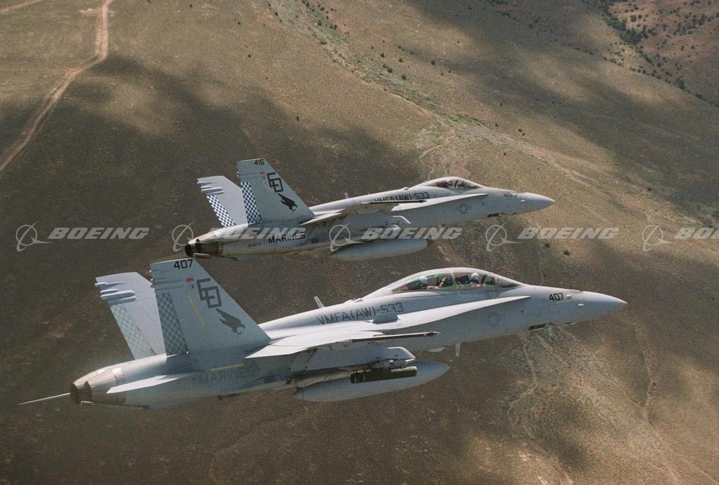 Two U.S. Marine Corps F/A-18s (a two-seat D model in foreground and a singe-seat C model in the background) fly over mountains during a training exercise near Naval Air Station Fallon, Nevada.