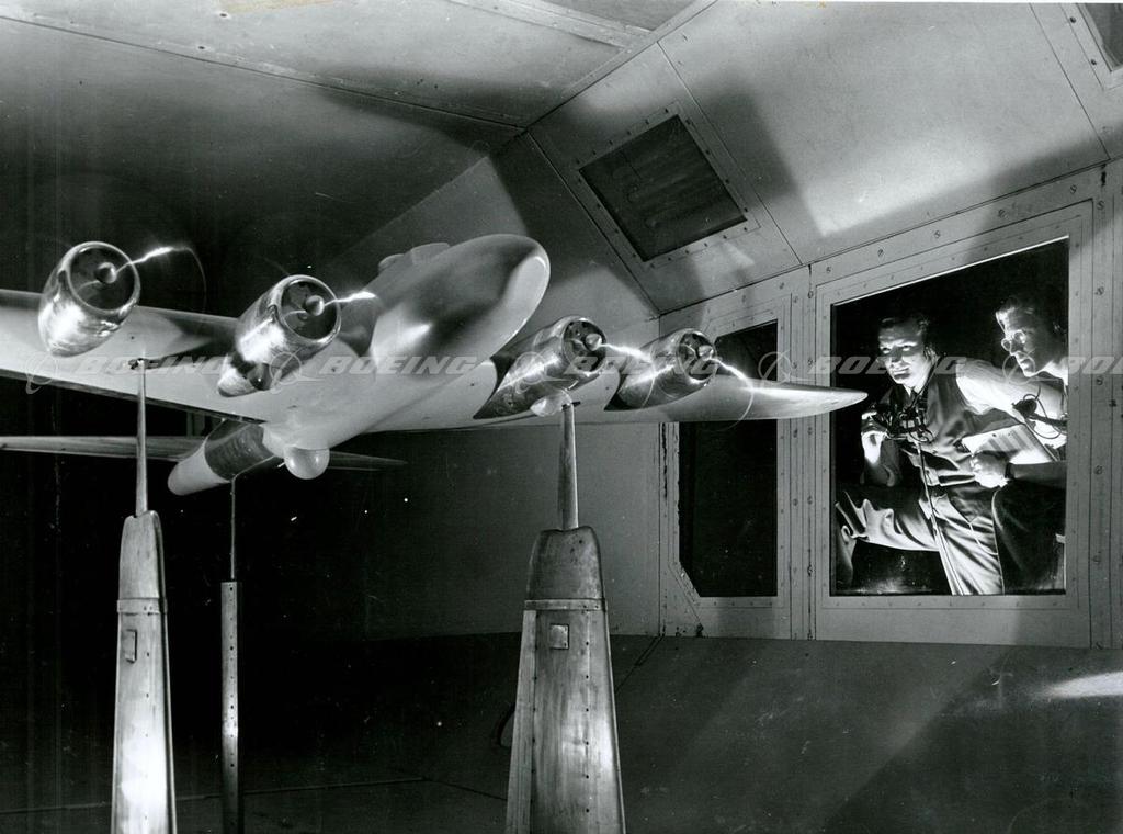 In this March 1944 photo, Boeing engineers Verl Nelson (left) and Bob Withington observe a test of the B-17 model in the then-new Boeing wind tunnel at Plant 2 in Seattle.