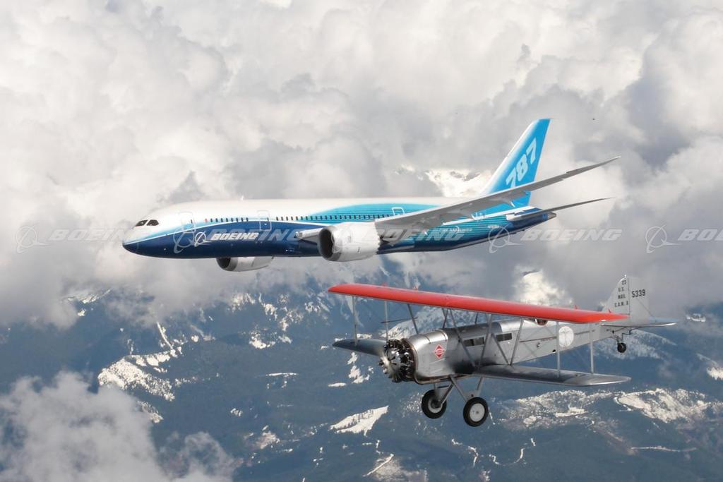Owned and flown by Addison Pemberton, Boeing Model 40 Serial number 1043 is the oldest flying Boeing aircraft of any kind. Boeing 787 ZA001 is the first Dreamliner. The Model 40A was the first Boeing airplane to carry passengers, with room for two people in a tiny cabin, as well as cargo space for mail. The 787 Dreamliner is the latest addition to the Boeing commercial line. The 787-8 Dreamliner will carry 210 - 250 passengers.
