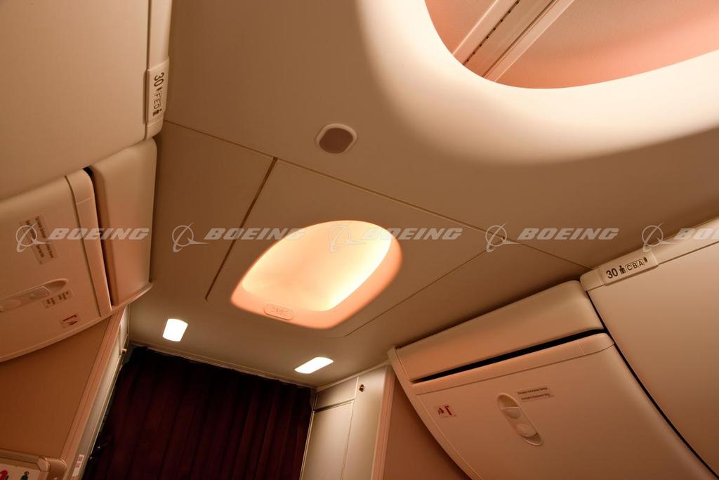 New cover lighting and curving architecture create a distinctive cabin. Programmed lighting schemes, such as the sunrise and sunset settings, offer airlines an opportunity to create different moods within the cabin. The combination of noise-dampening material against the airplaneās interior skin and a new design for the sidewall air grill makes the cabin quieter for a more comfortable flight. The air grill design also is more secure.