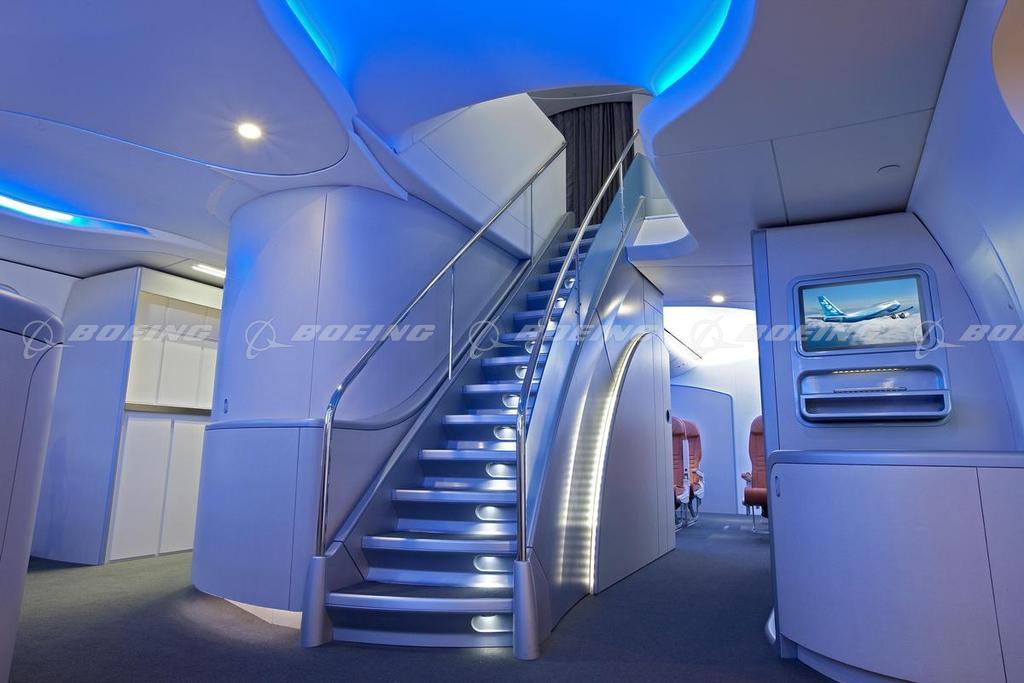 The 747-8 Intercontinental features a new interior with 787-like amenities. The interior incorporates new mood-lighting technology, as well as new lavatories developed for the 787. The newly designed entryway of the 747-8 takes passengers past a concierge station into the elegantly contemporary new interior. A dramatic stairway leads to the upper deck. The new curved, upswept architecture gives passengers great space and comfort, with more room for personal belongings.