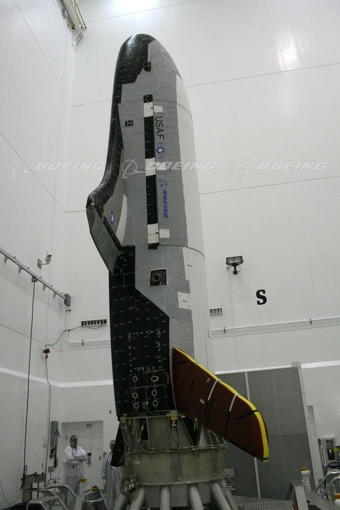 Weighing 11,000 pounds at launch and measuring 29 feet, 3 inches long with a wing span of 14 feet, 11 inches, the Boeing-built X-37B Orbital Test Vehicle is shown being processed for launch from Cape Canaveral Air Force Station. Built for the United States Air Force, the first flight will validate the technologies necessary for long-duration reusable space vehicles with autonomous re-entry and landing capabilities.