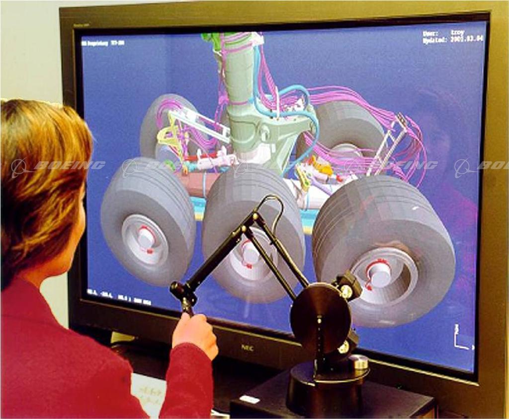A Boeing engineer manipulates a landing gear using a PHANTOM 6-DOF haptic interface, while specialized Boeing developed VPS software prevents that object from passing through neighboring objects. The user feels forces of contact as if manipulating an actual physical object.