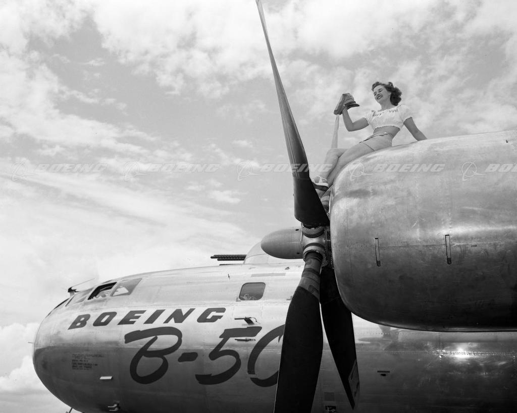 The four-engine, propeller-powered B-50 bomber, which first flew in 1947, was among the last piston-powered bombers built during an era that was to be dominated by jets. However, in 1949, the B-50A, the Lucky Lady II, made the first nonstop flight around the world in 94 hours, refueled in flight four times by KB-29Ms. The B-50 originally evolved from the B-29D but because it included so many improvements, it was redesignated the B-50A, with 59 percent more power than the B-29. The next version, the B-50B, fitted with cameras and wing tanks, was designated RB-50B and used for strategic reconnaissance. The B-50D, the most common variant, was distinguished by a one-piece transparent-plastic nose molding and an optically flat bombardier’s window in the lower portion. Some B50s were later converted to hose-type KB-50 aerial tankers, their speed enhanced by the addition of two 5,200-pound-thrust jet engines, so at 400 mph, they could refuel jet aircraft. One KB-50D became a drone to test Bell XGAM missiles and 36 became long-range reconnaissance aircraft (WB-50D).